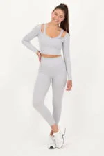 Rib fabric has a very good and strong quality. This makes the fabric extremely suitable for any workout. The fabric has a fine, warm look and also feels wonderfully soft. This longsleeve Crop top has a beautiful and feminine neckline and is great to combine with the matching bra and scrunch leggings. Time to shine✨