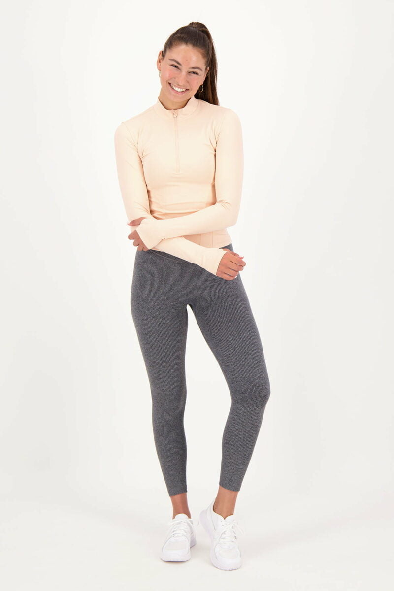 This sporty long-sleeved top with ¼ zip at the neck is suitable for a good running workout or other outdoor sports. There is a fabric protective cap at the zip which prevents the zip from chafing at the neck/neck. The top features long sleeves with thumb openings and has a nice fit thanks to the beautiful feminine lines at the front.
