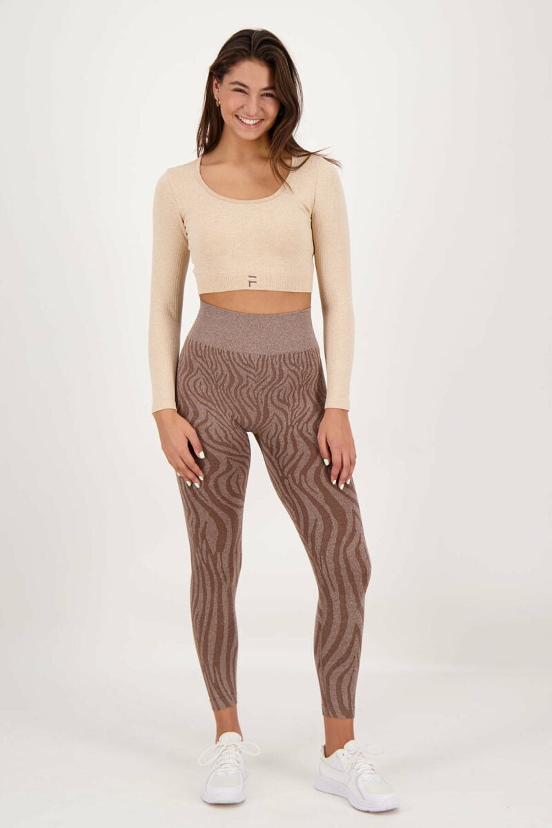 The beautiful contour scrunch at the buttocks is combined with a high and firm waistband to create the perfect shape. A combination of a modern zebra print and different trendy. We love it!